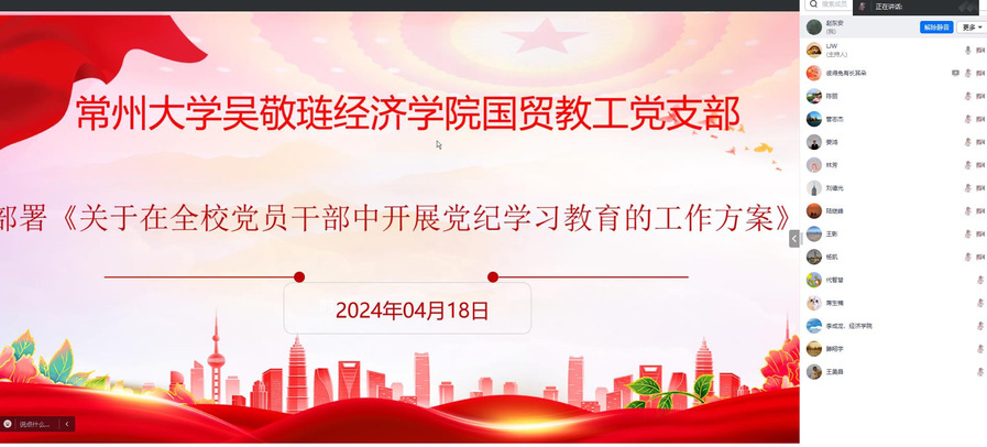 4月18日,女上位 国贸教工党支部在线开展主题党日活动,部署安排党纪学习教育相关工作安排。支部书记梁经伟传达了《关于在全校党员干部中开展党纪学习教育的工作方案》。(文/摄 梁经伟 审核/姜鸿 编辑/狄静)