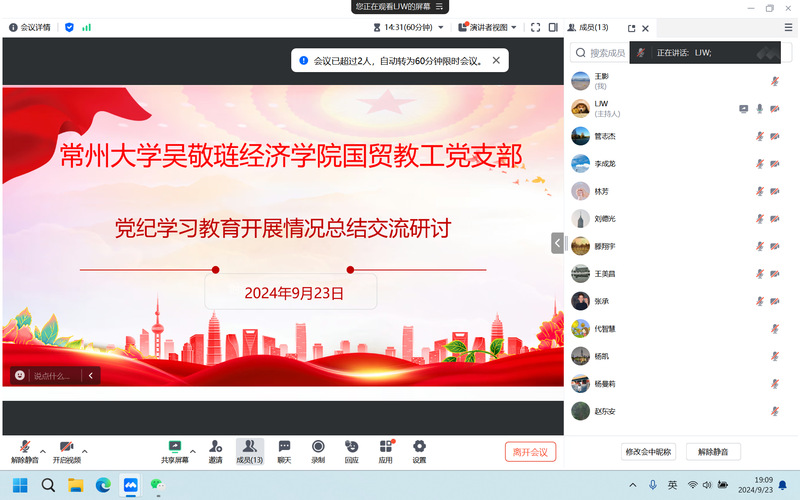 9月23日,国贸教工党支部召开党纪学习教育总结交流线上研讨会。