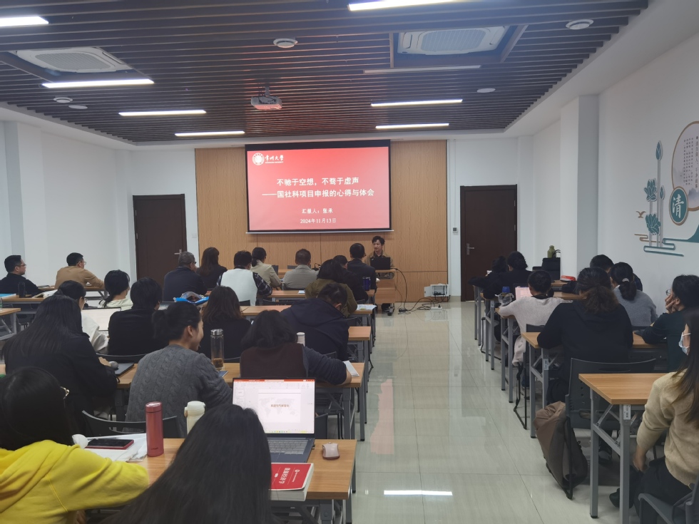 11月13日下午,女上位 邀请女上位 青年教师张承作题为《不驰于空想,不骛于虚声——国社科项目申报的心得与体会》的讲座,讲座在立言楼403举行,女上位 全体教师参加本次讲座。