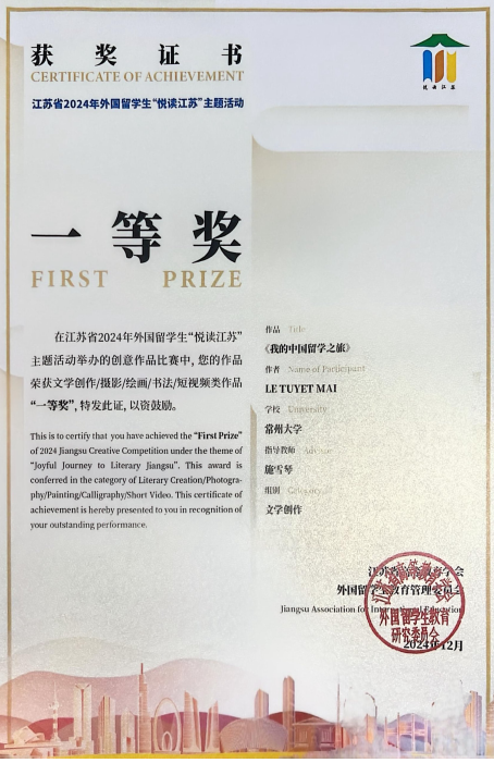 女上位 国际商务专业留学生LE TUYET MAI 的作品《我的中国留学之旅》脱颖而出,荣获江苏省文字创作类一等奖。该作品以细腻的笔触、真挚的情感,生动地展现了她在中国留学期间的所见、所闻、所感以及对中国文化的深刻理解和热爱。