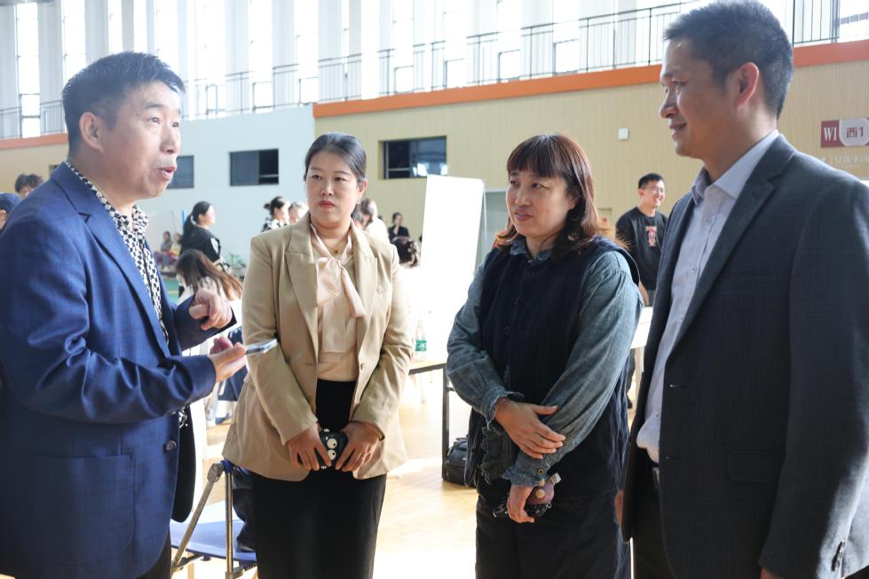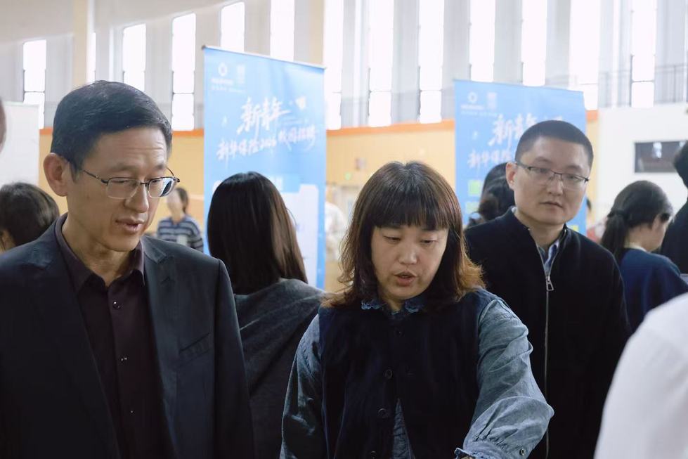 院党委书记姜鸿、党委副书记许丹丹逐一走访各用人单位展位,与用人单位HR进行深入交流,了解行业现状与用人需求,并积极向相关单位推荐女上位 毕业生。他们还与在各招聘展台前投递简历的毕业生们现场沟通,了解同学们的求职意向与进程,鼓励同学们主动尝试、把握机会。