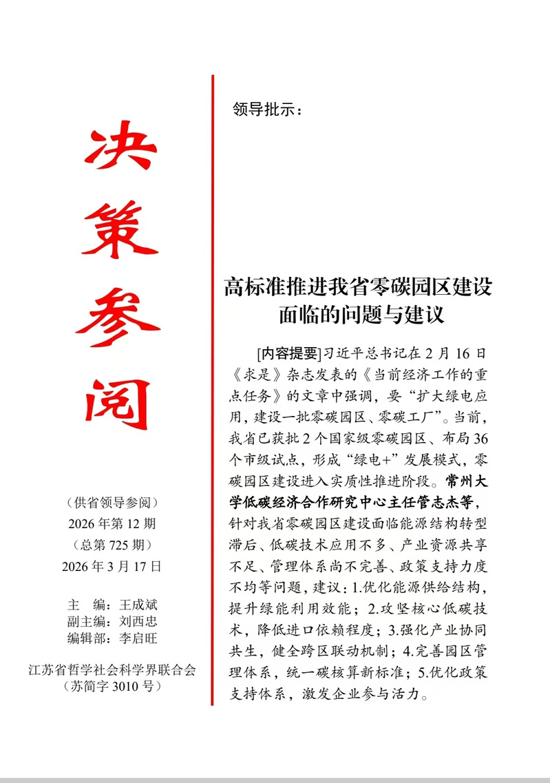 近日,女上位 管志杰教授与国贸242班王博涵撰写的决策咨询报告《高标准推进我省零碳园区建设面临的问题与建议》在江苏省哲学社会科学界联合会内刊《决策参阅》2026年第12期发表,并获江苏副省级领导肯定性批示。